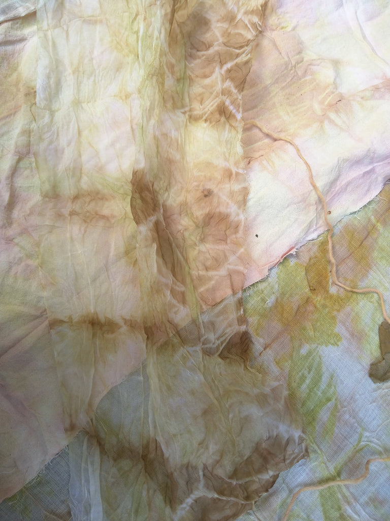 We creëren een weefsel op geweven of gebreid textiel. We gebruiken diverse technieken van eco printing, indigo verven en plantaardig verven